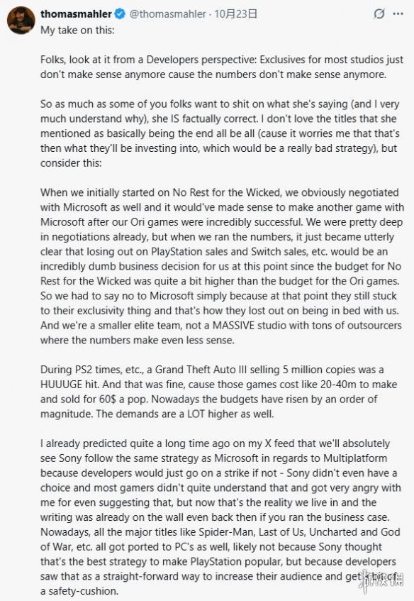 因Xbox 女总裁 Sarah Bond“独占游戏已过时” 的言论在社交媒体上引起热议,曾制作过《奥日》《恶意不息》等作品的Moon Studios的联合创始人Thomas Mahler以开发者身份和拒绝微软独占的亲身经历,用成本账和行业现状印证“独占模式”的过时。