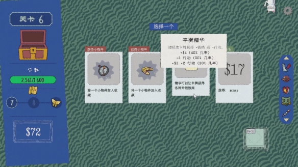 这些元素的加入,使得每次游戏都不仅仅是简单的挑战,而是一次深度的策略规划与资源管理。玩家需要根据不同的游戏情况,灵活调整卡组和小物件选择,以应对逐步升级的挑战。