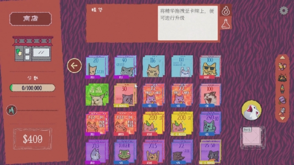 除此之外,《双喵成行》还设有5类精华和18种不同的升级效果。精华是提升玩家卡组实力的核心机制,能够为卡牌添加额外的增益效果,例如“平衡精华”能够随机让卡牌在结算时获得金钱或行动数,而“欢欣精华”则会直接让卡牌获得分数倍率。