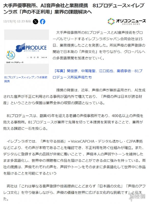 据报道,大型声优事务所81 Produce与在全球范围提供AI语音技术的普勒姆帕斯于15日宣布达成业务合作。此举旨在保护其所属声优的声音录制“始于日本的声优文化”,同时加速向全球推广多语言化内容。