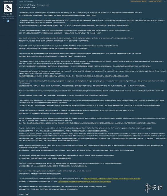 《GTA6》确认延期的消息公布后不久,一位匿名员工在《GTA》论坛“GTAForums”发帖,爆料了Rockstar内部的一些情况。此前Rockstar以“严重不当行为”为由解雇了超过30名员工。英国首个游戏行业工会——独立工人联合会(IWGB)批评此举为“游戏行业史上最公然、最无情的打压工会行为之一”。