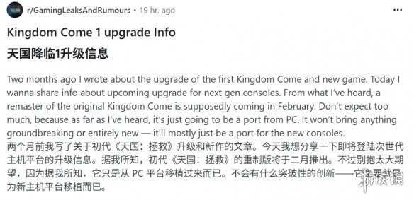 近期,曾精准预测《天国:拯救2》续作延期情况的业内知名消息人士bertik11,向外界透露了有关该复刻项目的详细信息。他指出,复刻版是在现有的PC版本基础上进行开发的,在技术层面的升级幅度可能比较有限。他直言:“大家切勿过度期待。据我所掌握的情况,这本质上就是将PC版直接移植过来,不会带来具有突破性的内容或者全新的游戏要素,主要目的在于让游戏能够适配当代的主机设备。”