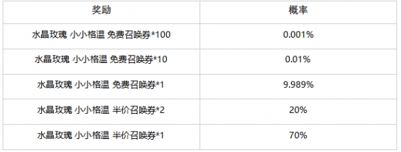 祝福玫瑰有小概率暴击为水晶玫瑰。暴击获得蓝色水晶玫瑰的弈士,可额外免费领取「小小格温(附赠进攻特效)」;暴击获得红色水晶玫瑰的弈士,可额外免费领取「水晶玫瑰 小小格温(附赠进攻特效)」。蓝色水晶玫瑰每日全服限量发放10朵,红色水晶玫瑰每日全服限量发放1朵。若弈士在领取「小小格温」或「水晶玫瑰 小小格温」时已拥有该小小英雄,可选择该账号其他未拥有大区领取。