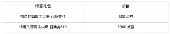 特惠召唤:活动期间,玩家可付费解锁格温的剪剪尖尖塔召唤券礼包(每个礼包单Q单大区限购1次),内容及价格如下: