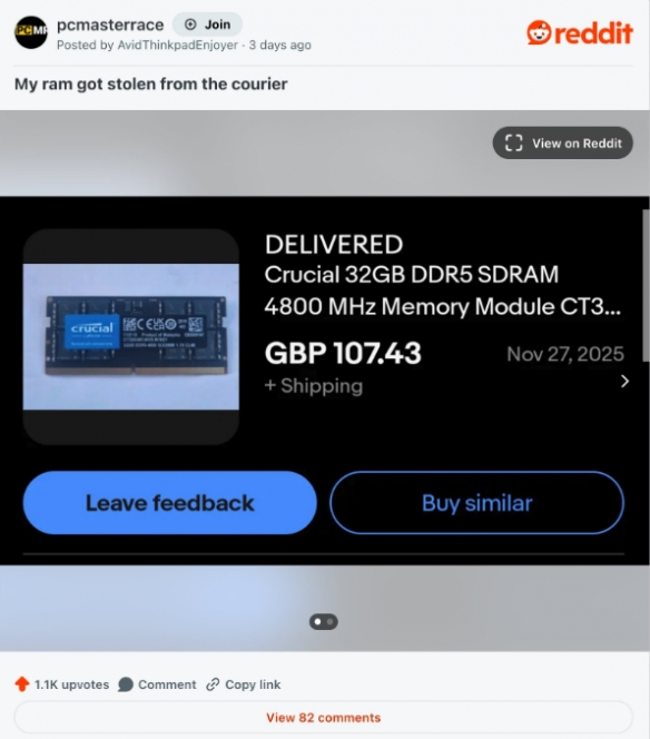 AI技术的迅猛发展正引发一场全球性的内存供应危机。由于DRAM芯片需求激增,内存条价格已飙升至接近贵金属的水平,这不仅令普通玩家装机升级变得困难,更催生了针对内存产品的新型盗窃案件。近期有Reddit用户反映,其订购的内存条在配送过程中于异常时间、异常地点被“送达”,最终只收到空包裹,此类情况在全球多地均有出现。