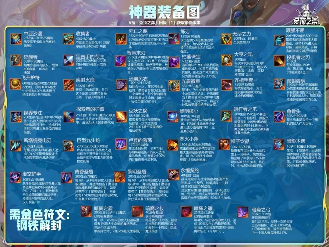 云顶之弈 S16版本 英雄联盟 传奇主题,在新赛季会增加很多新的羁绊和棋子,还有不少老羁绊,老英雄的回归,那么有不少小伙伴好奇新赛季有哪些装备,那么下面就给大家带来s16神器装备一览图。