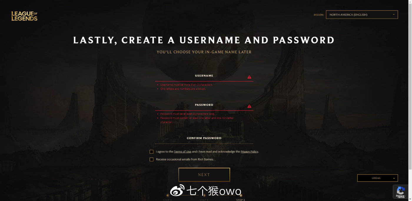 在USERNAME这一栏输入游戏账号名,在PASSWORD这一栏输入密码并确认,之后再次点击 NEXT