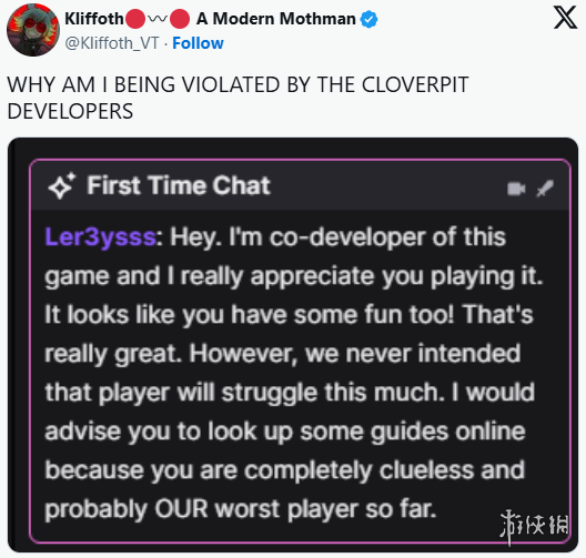 Steam新作《CloverPit》近日以其令人上瘾的肉鸽循环与赌博机制风靡网络,但并非所有玩家都能轻松驾驭——甚至引来了开发者的亲自“关怀”。据主播Kliffoth透露,在他直播《CloverPit》时,游戏联合开发者竟现身直播间,对他的游戏技巧进行了犀利点评。Kliffoth在推文中惊呼:“为什么我会被《CloverPit》开发者公开处刑?!”并附上了直播时收到的开发者留言截图。