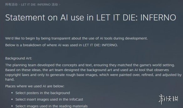 随着游戏行业对人工智能技术的应用日益普及,Valve公司对Steam平台上的游戏提出了更严格的披露要求。《LET IT DIE: INFERNO》开发团队Supertrick Games此次发布的公告,被视为对这一合规要求的积极响应。在官方发布的“AI使用声明”中,开发团队详细列出了AI技术介入的具体资产类别,展现了开发流程的透明度。