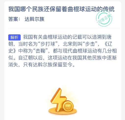 我国哪个民族还保留着曲棍球运动的传统?【蚂蚁新村每日一题】2025年12月17日题目已发布!坚持答题,积累木兰币,即可加速小镇建设。答对本题,立即可享“产速+3/时”的加速奖励!今天正确答案是【达斡尔族】。 我国达斡尔族至今仍保留着曲棍球运动的传统。自辽代以后,这项运动在我国其他民族中已逐渐消失,唯有达斡尔族将其传承至今。