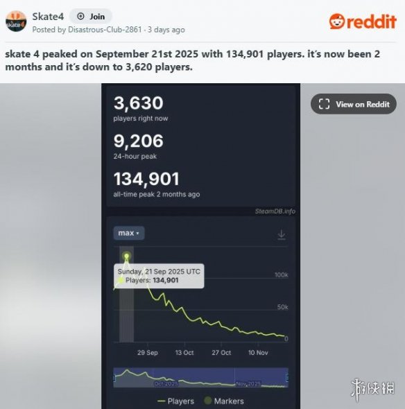 在“Skate 4”子版块中,近期出现了多篇讨论玩家数量下滑的帖子。据Reddit用户Disastrous-Club-2861指出,游戏近期活跃玩家数仅为3620人,较9月21日首发峰值134901人相比,跌幅显著。