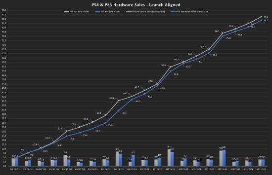根据索尼发布的财报数据图表,PS5的销售势头持续保持高位。目前,PS5的累计硬件销量已达到8420万台,与PS4同期(8630万台)的差距正在显著缩小。在刚刚结束的FY25第二季度(Q2)中,PS5硬件销量更是达到了390万台,延续了其强劲的季度出货量,显示出市场对这款次世代主机的持续热情。