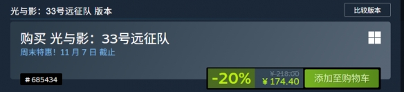 作为今年TGA游戏最有力竞争者,《 光与影:33号远征队 (Clair Obscur: Expedition 33)》在Steam平台迎来新史低,原价218元, 现8折仅需174.4元,活动截止到11月7日,感兴趣的玩家千万不要错过。