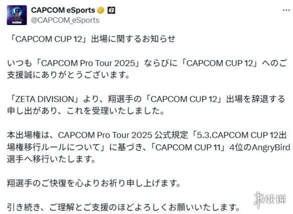 根据赛事规则,其已获得的CAPCOM CUP 12参赛资格将由CAPCOM CUP 11中位列第四的选手AngryBird接替。