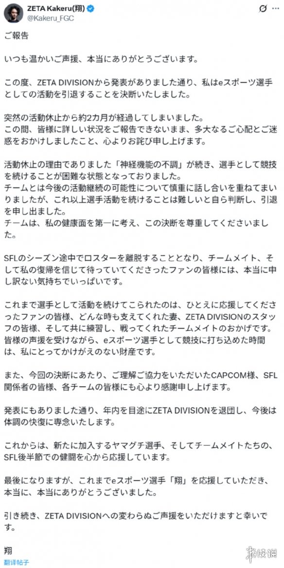 Kakeru透露,自2025年8月因健康原因退出EWC电竞世界杯以来,其所患的“神经功能障碍”问题持续影响竞技状态,导致无法继续维持职业参赛水平。在与所属战队ZETA DIVISION协商后,最终决定正式退役。