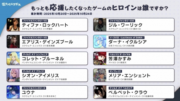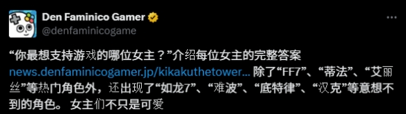近日,日媒Den Faminico Gamer公布了由读者评选出的“最想应援的10位游戏女主角”,让我们一起来看看排名情况吧。