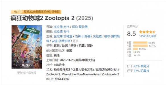 在口碑方面,《疯狂动物城2》在豆瓣平台的评分由开分时的8.7分略降至8.5分,已有超过31万用户参与评价。评分结构中,42.1%的观众给予5星,43.1%给予4星,13.9%给予3星。