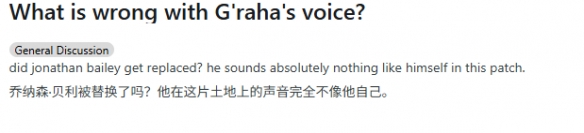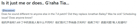 "难道只有我一个人觉得,"一位资深玩家在Reddit上发问,"古·拉哈·提亚在7.4版本里的声音听起来不太一样吗?"他们质疑长期为该角色担任英文配音的乔纳森·贝利是否不再参与演出:"有人知道具体情况吗?"评论区的粉丝们纷纷推测贝利声音变化的原因。