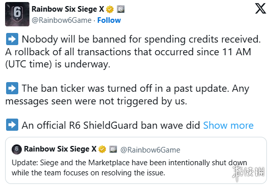 《彩虹六号:围攻》近日出现异常:离奇的游戏内消息、账户被注入数十亿点数,更有玩家凭空获得开发者专用皮肤。部分玩家还遭遇了错误封禁,随后游戏遭黑客入侵的传言迅速扩散。育碧官方账户发布最新公告,承诺不会惩罚使用异常点数的玩家,并澄清比赛中的异常消息并非官方触发(此前更新已关闭封禁提示)。育碧同时宣布将把全服交易数据回滚至UTC时间12月27日上午11点(即混乱发生前的安全时间点),并说明其ShieldGuard系统在此期间实施的封禁与本次事件无关。