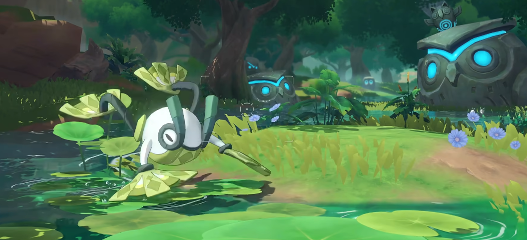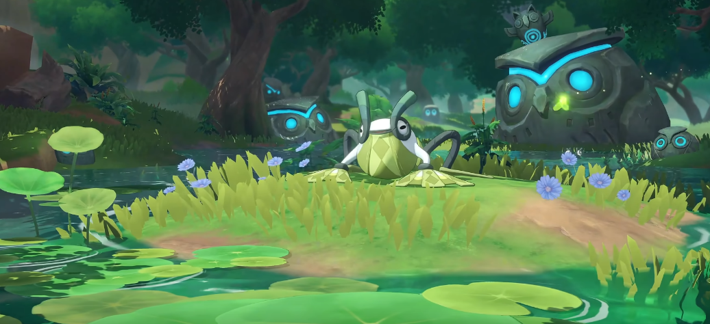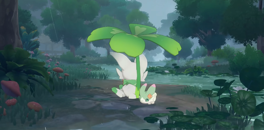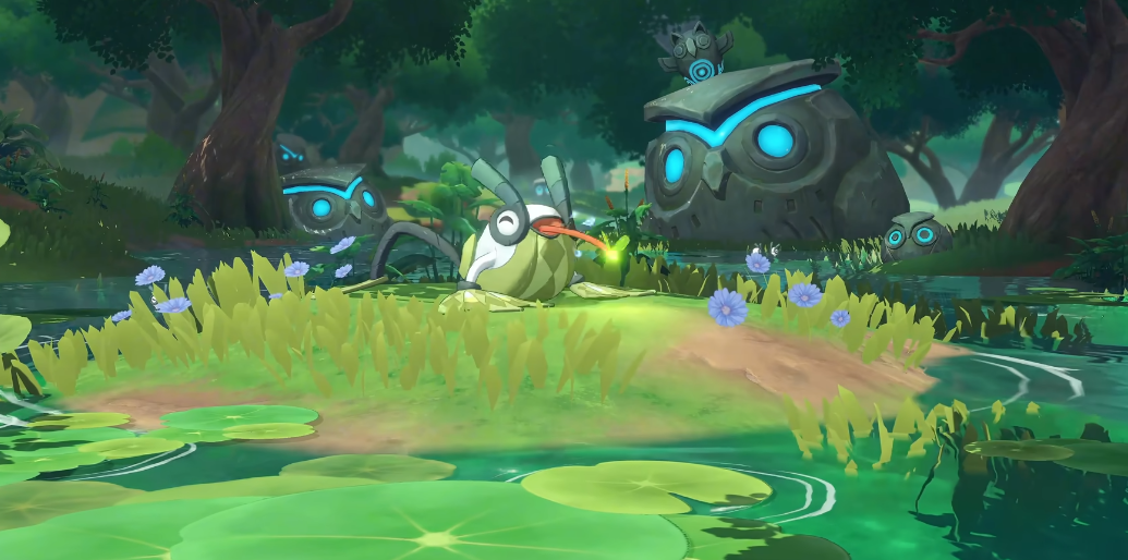 上岸蛙属于是全新设计的精灵类型,在外形上整体参考绿色荷叶的花纹,四肢是白色的,巧妙的是将青蛙的4个蹼都设计成荷叶形状,将精灵的形态和精灵喜欢的生态结合起来。