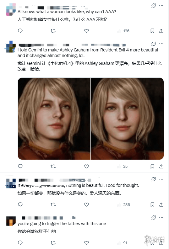 目前玩家的讨论观点主要可分为三类:一类支持修改的玩家认为,“AI都知道怎样算漂亮,不知道其他人还在坚持什么”。另一类反对者则表示:“如果所有角色都变得这么美,那角色的独特性还有什么意义?”
