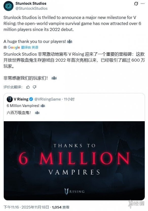 Stunlock Studios首席执行官Rickard Frisegård在庆祝公告中动情地表示:“600万玩家是我们团队与社区共同谱写的非凡篇章。我们由衷感谢玩家们自游戏发售以来始终如一的支持,这个里程碑属于我们每一个人。”