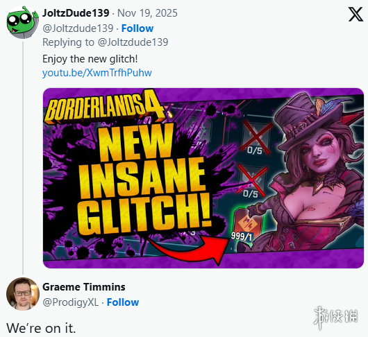 《无主之地4》创意总监格雷姆·蒂明斯已回应:"我们正在处理。"鉴于BUG的严重性,修复预计将尽快推进。若想体验该BUG,玩家需争分夺秒——除非通过热修复紧急处理,否则最晚可能在11月20日或27日的更新中被修复,几乎不可能留存至月底。