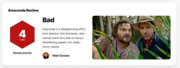 IGN简评:对导演Tom Gormican来说,《新狂蟒之灾》是一次令人失望的尝试。他未能成功驾驭索尼影业这次令人困惑且名不副实的“水生非恐怖”重启之作。