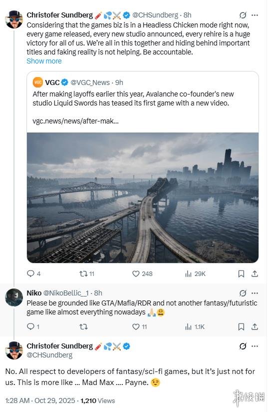 "我们尊重奇幻/科幻游戏开发者,"桑德伯格谈及工作室对粗粝现实风格的偏爱时表示,"但这确实非我们所求。"Liquid Swords成立于2020年,其官网宣称目标在2024年初前集结百人团队——"这是实现高效游戏开发的最佳规模"。2025年2月,工作室在尚未正式公布项目时就做出了"深表遗憾"的裁员决定。
