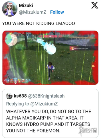 这一认知在《宝可梦传说 Z-A》中被彻底颠覆。在游戏重构的密阿雷市区域,玩家可遭遇被称为"头目"的红色瞳光野生宝可梦。而在维尔特广场公园的深水区或草丛中,潜藏着一只能够使用水系强力招式"水炮"的头目鲤鱼王。由于野生宝可梦会主动攻击训练家,加上水炮本身的超远射程与头目宝可梦的高伤害加成,不少玩家在公园遭遇了" 非自愿高压水洗"(注:指被水炮秒杀)。