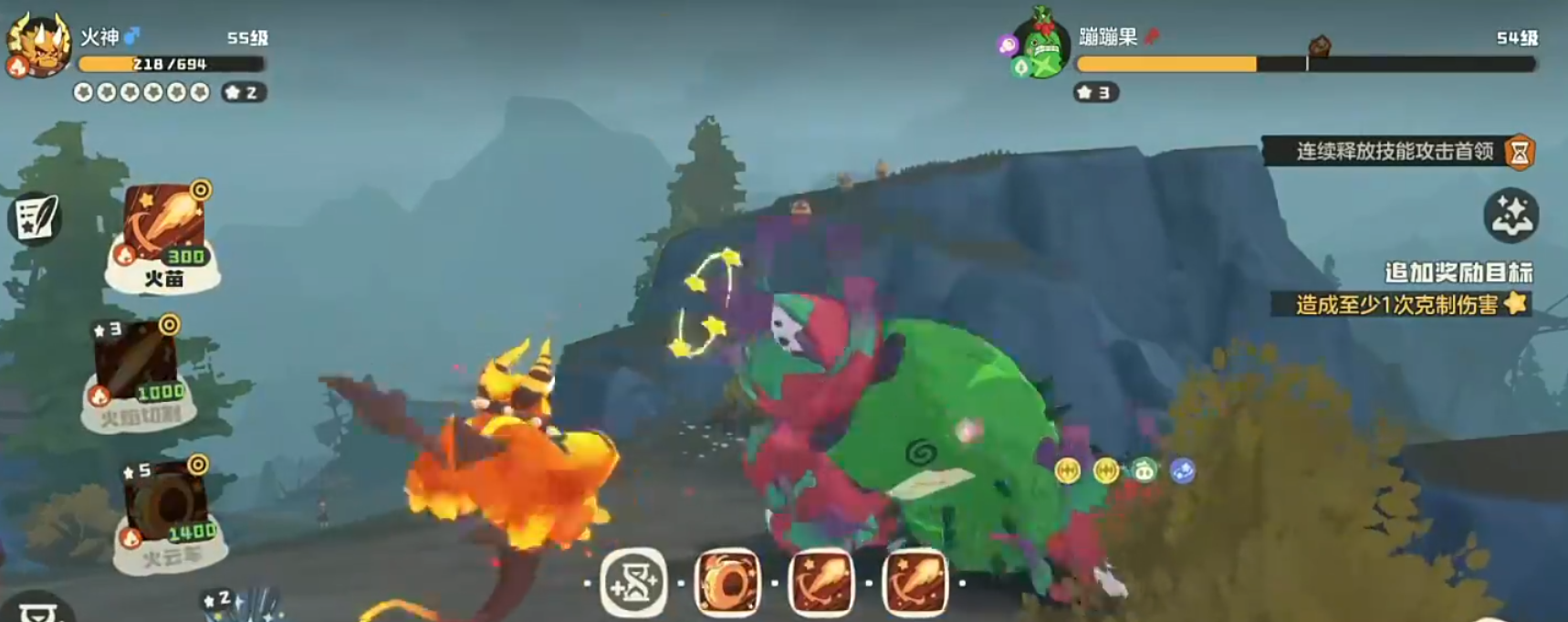 进入第二阶段初期,boss仍处于第一阶段遗留的眩晕状态,此时应立即使用“力量增效”技能叠加攻击力,为后续输出做准备。不久后,蹦蹦果将发动高威力草系七星级技能“光能聚焦”,该技能本身伤害极高,且首领在使用五星级以上技能时伤害翻倍,若未携带生命增益极易被一招击败。只要成功扛过此轮爆发,便可利用“火焰切割”、“火苗”等火系技能稳定压制,逐步将其击败。