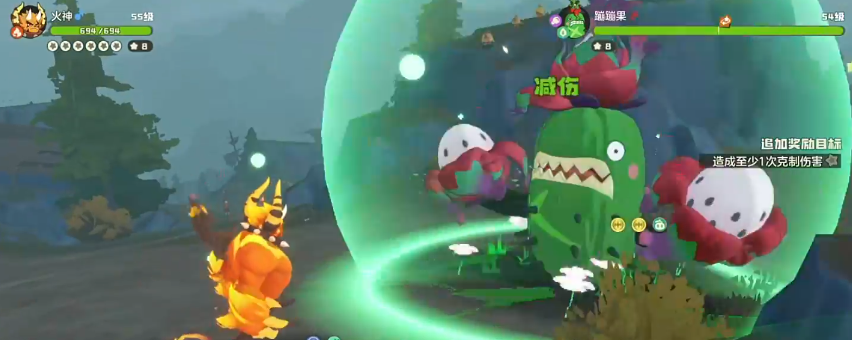 成功击破护盾后,系统将提供三项增益选择。若队伍缺乏物攻加成,推荐优先选取生命值提升效果,以增强第二阶段的生存能力。随后进入精灵对战模式,面对草属性为主的蹦蹦果,火系精灵“火神”是最佳应对人选,凭借属性克制可大幅提高输出效率。