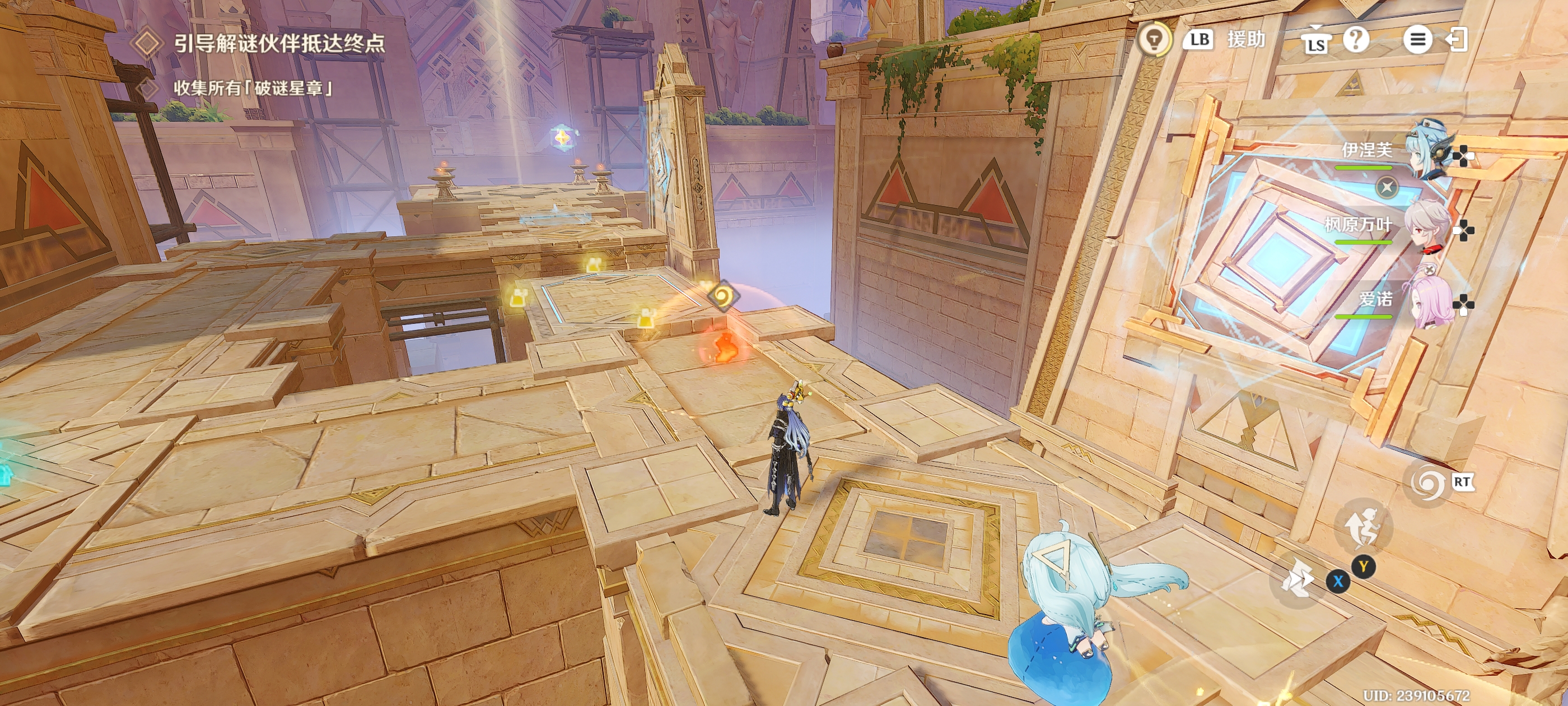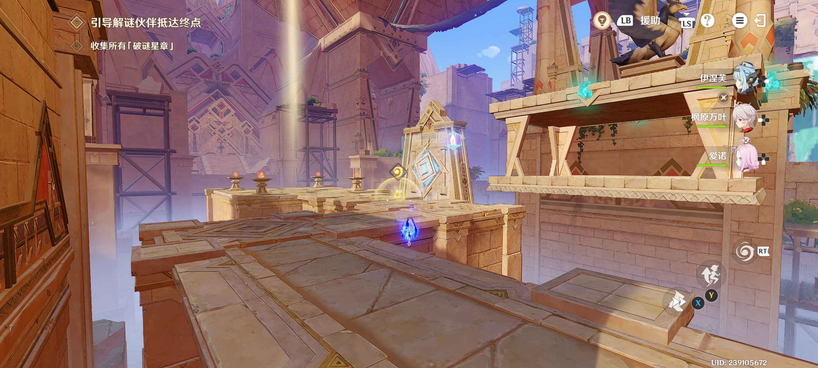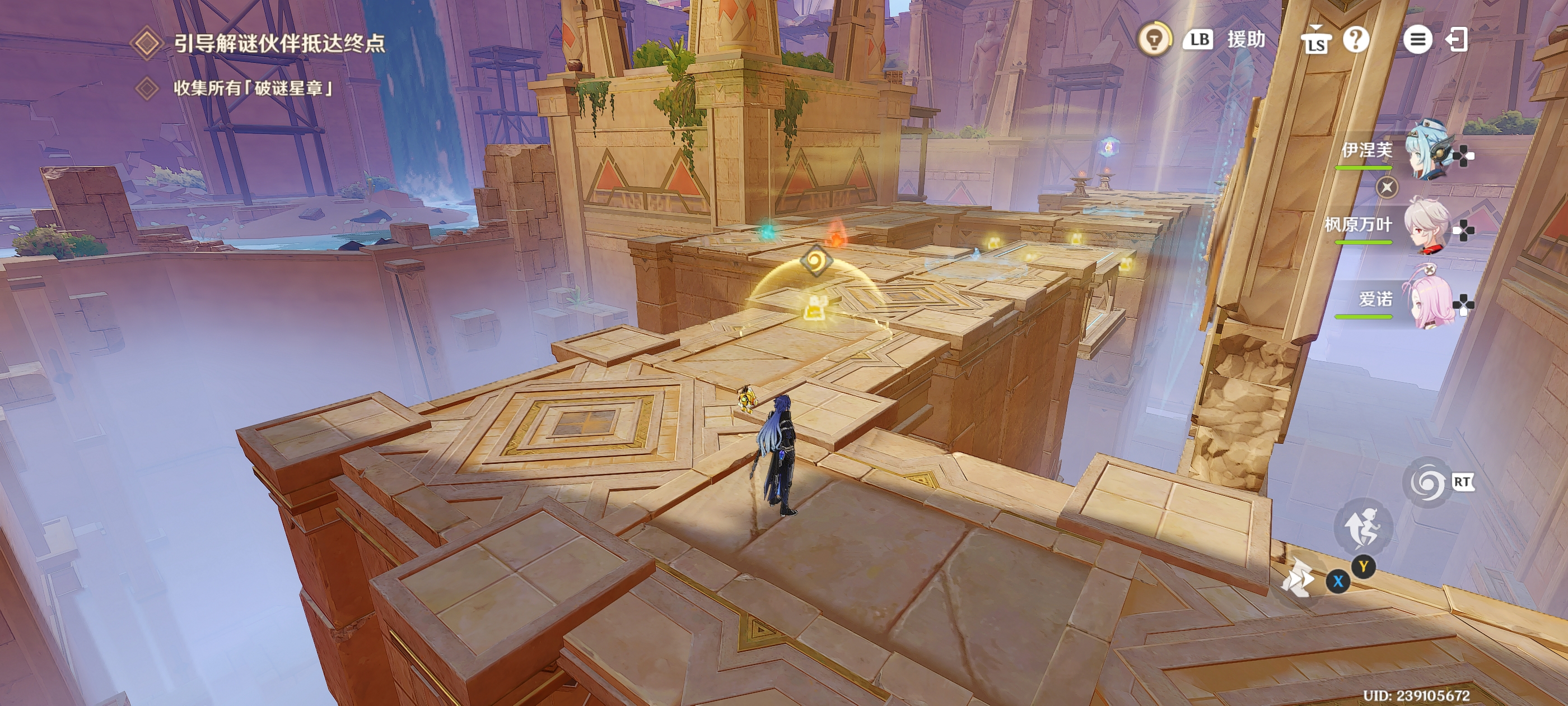 放置后,移动到[升腾奇效]旁,将其拾取并来到图中的位置上,当解密伙伴来到升降台上后迅速将[升腾奇效]放置在升降台上;(如时机没赶上可将持有的[磐固奇效]放置上去重新来过)