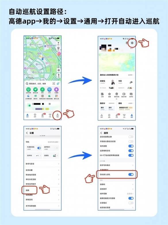 具体设置路径如下:打开高德地图App → 点击【我的】 → 点击右上角【设置】图标 → 点击【通用】 → 打开【自动进入巡航】。完成设置后,每次驾驶时只需打开高德地图,无需任何其他操作,系统便会自动进入巡航状态,由“鹰眼守护”为您的全程安全护航。