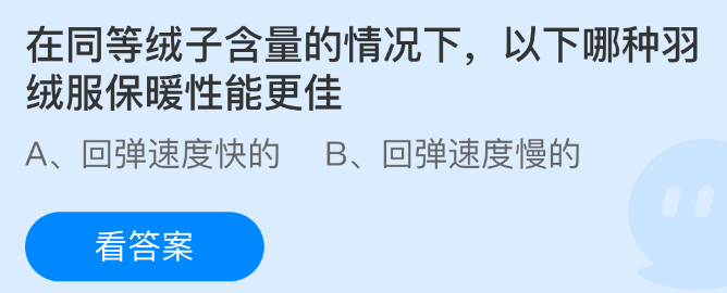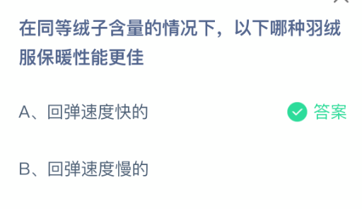 在同等绒子含量的情况下,以下哪种羽绒服保暖性能更佳?支付宝小鸡课堂开课啦!每天花一分钟答题赚饲料,喂喂小鸡就能贡献爱心啦!轻松又意义十足!2025年12月29日蚂蚁庄园的小鸡课堂题目正确答案是【回弹速度快的】, 在同等绒子含量的情况下,【回弹速度快的】羽绒服保暖性能更佳。