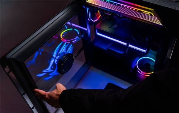 其中,机身前面板配备两组215mm全息风扇,拥有404个LED发光灯珠、侧面板则拥有380mm风扇及720个LED灯珠,可实现包括Solo、Fusion、Sync三种显示模式,玩家可通过奥创智控中心手动调节,支持MP4、PNG、GIF在内多种格式,创意与个性从不受限。