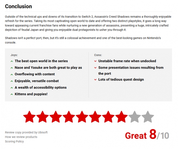 育碧开放世界大作《刺客信条:影》现已登陆Switch2,本作对平台进行了专门的优化,并添加了一些新功能。今日,外媒nintendolife对本作的Switch2进行评测,打出了8分的成绩。