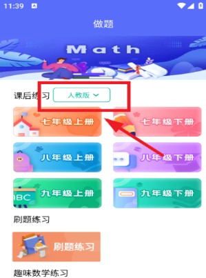 初中数学助手app怎么更改教程,用户在本站下载安装好软件,点击手机桌面图标,打开app,进入首页看到默认的是人教版,点击一下,点击你要的版本就行了。